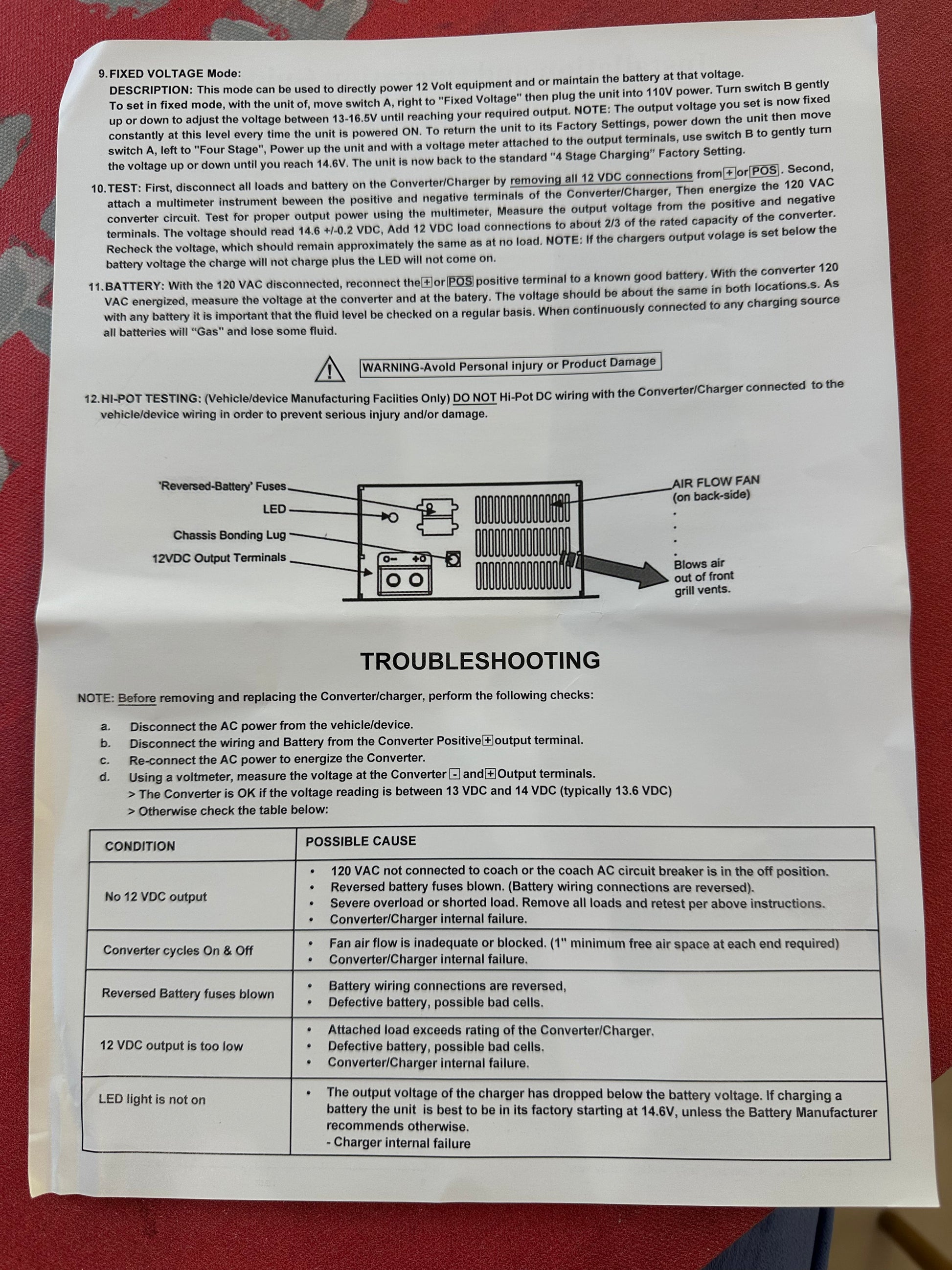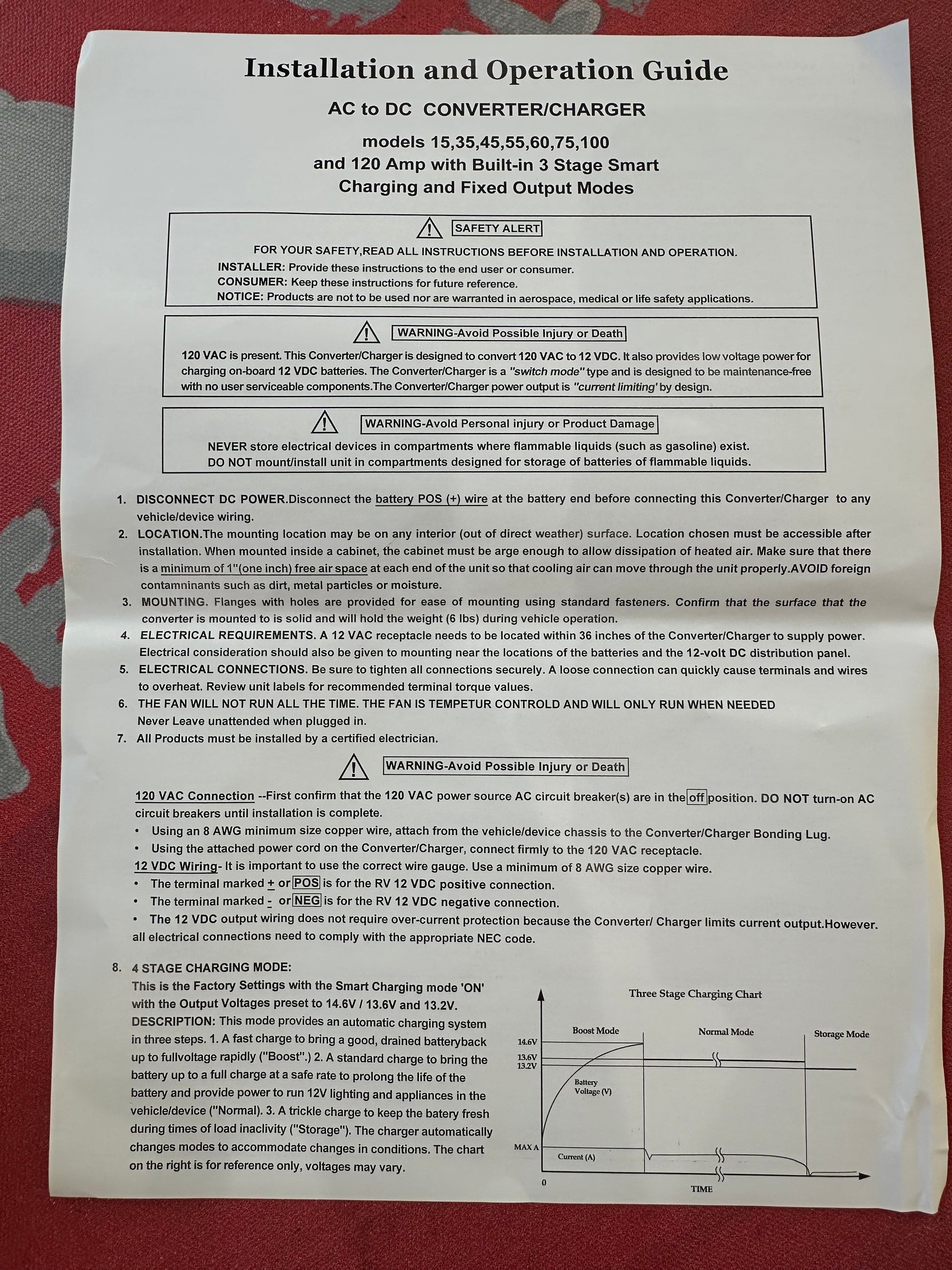AC TO DC CONVERTER / CHARGER Beefy unit that's painfully simple to install with built in mounting flanges and an AC power cord to plug into standard 110/120v outlet. DC output is via junction set screw style terminal block: -positive (red) -negative (black) Simply strip your heavy gauge battery charge wires and insert into the junction and tighten firmly. DONE! Great for RV's or anywhere you need 12v DC power with high amperage. Use on your test bench to keep battery banks topped off or in your automotive shop to send 12vDC power to the vehicle. 3 Stage Charger Built in Smart Chargers Current limiting design automatically shuts down power during overload or short-circuit conditions