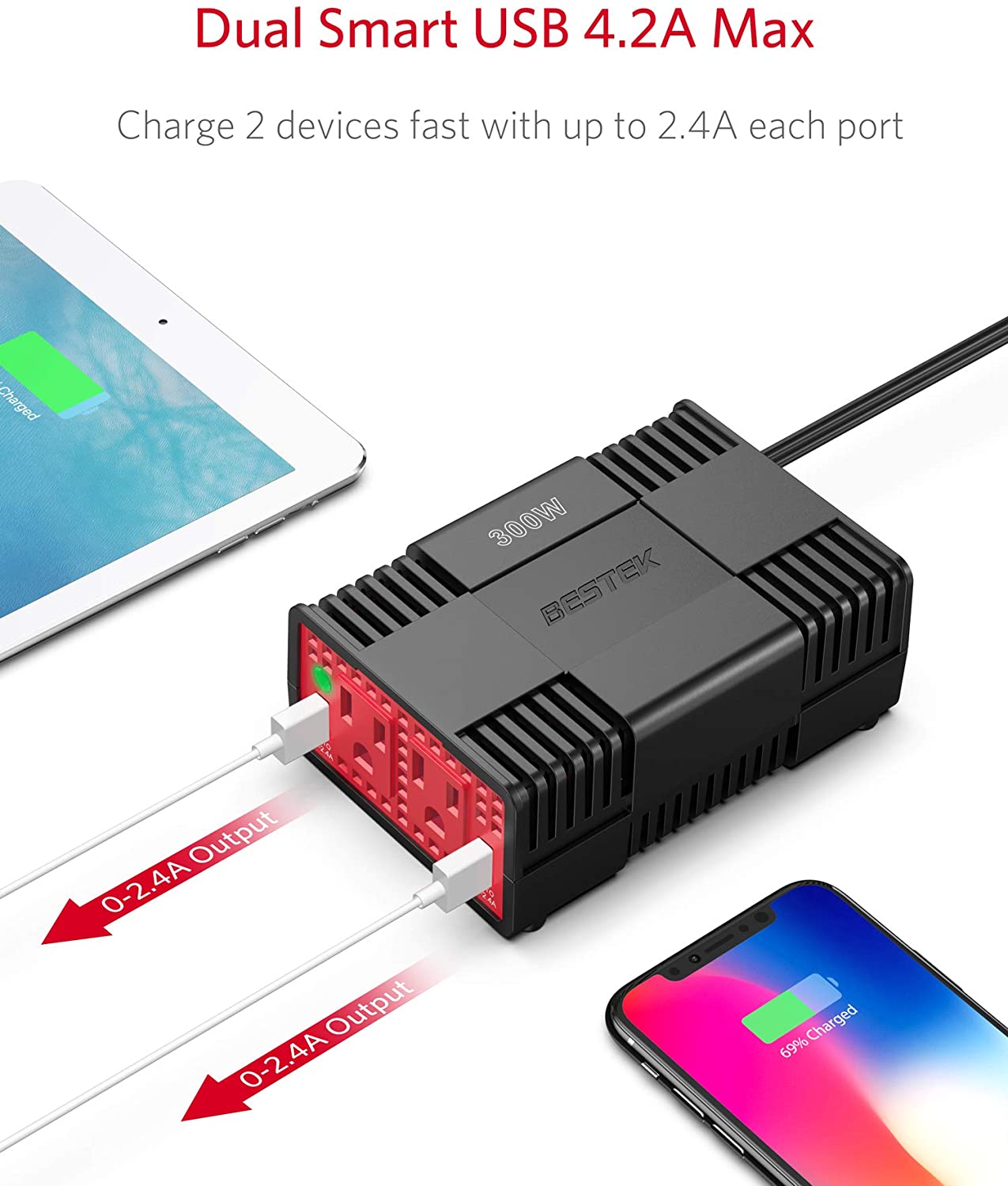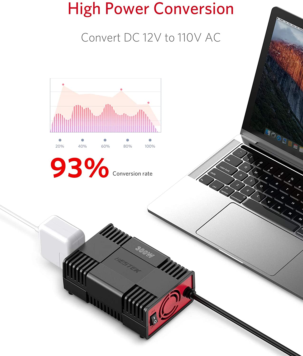 Convert DC 12V to 110V AC, can be used to charge or powering most portable electronic equipment which rating power is under 300 watts.