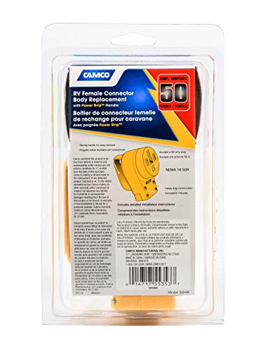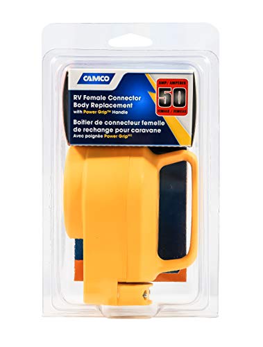 Camco RV 50 Amp Female Replacement Receptacle replaces the existing power cord receptacle utilizing patented PowerGrip handles for ease of use.