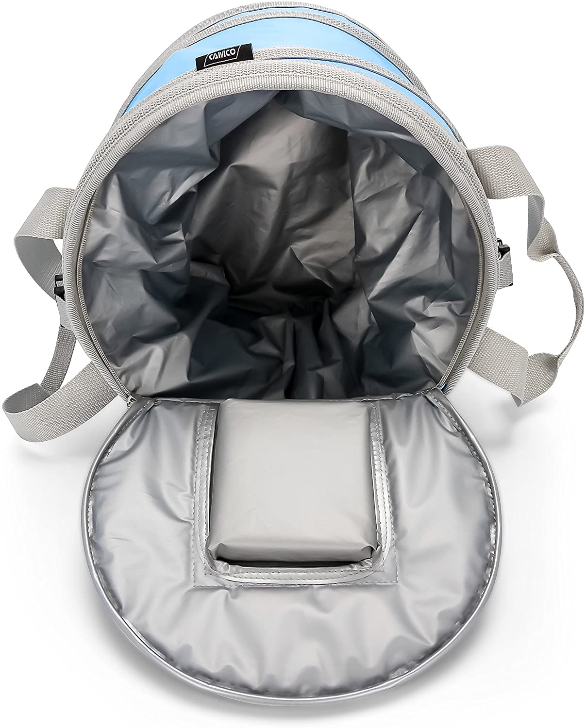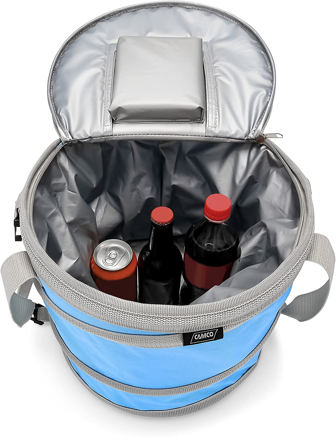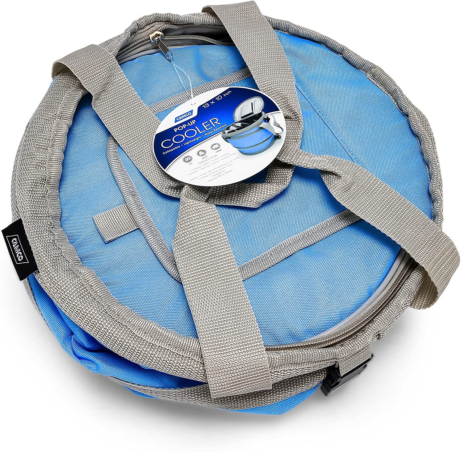 Pop-Up Cooler is a great addition to any campsite, golf game, picnic, tailgate or grocery run. The lightweight, convenient cooler pops open for use and collapses flat for storage. A water resistant interior prevents leaks, spills and condensation, and the insulated access hatch allows you to retrieve food and beverages while minimizing cold loss. Cooler features a zippered lid, carry handles and a buckle strap to keep the cooler flat when it is not in use. Also includes a bottle opener. 13" diameter by 10-1/2" tall when expanded and collapses to 3" tall for storage. Will hold up to a 12-pack of bottled or canned drinks.