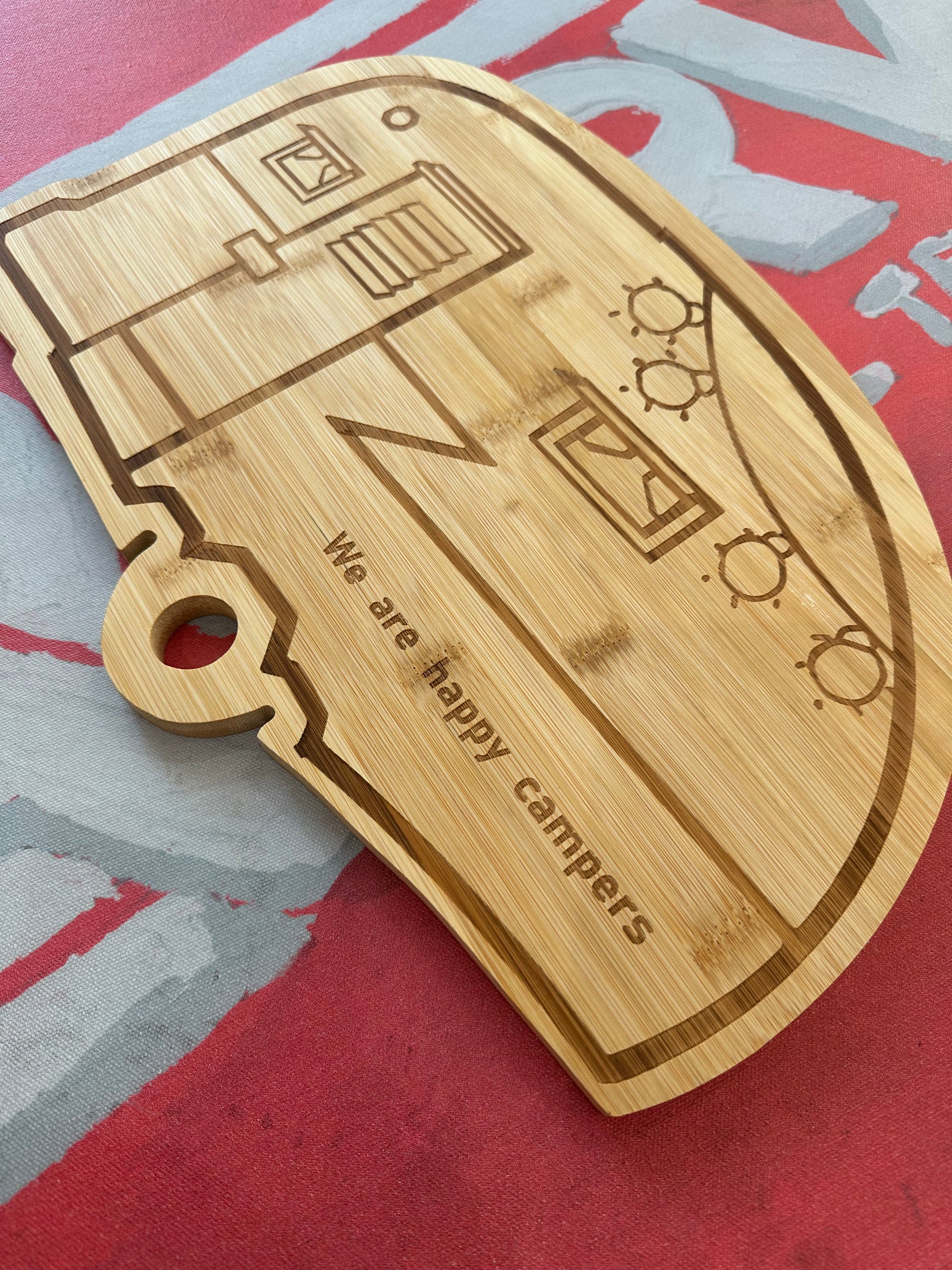 Life is Better at the Campsite RV Shaped Bamboo Cutting Board is made of durable, premium quality bamboo construction. It is perfect for cutting vegetables, fruits, meats and cheese and its RV-shaped design also makes for a great decorating accessory for your kitchen. The cutting board won't damage or dull your knives. Bamboo features natural properties and it resists moisture for easy maintenance.