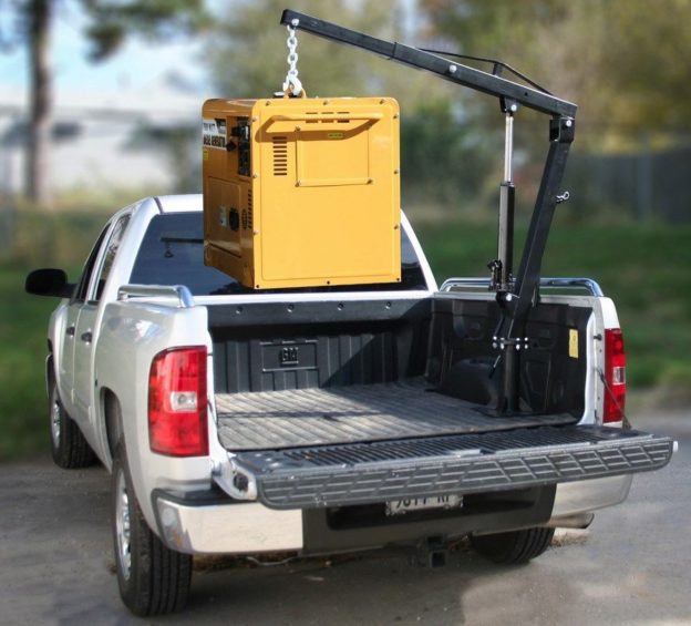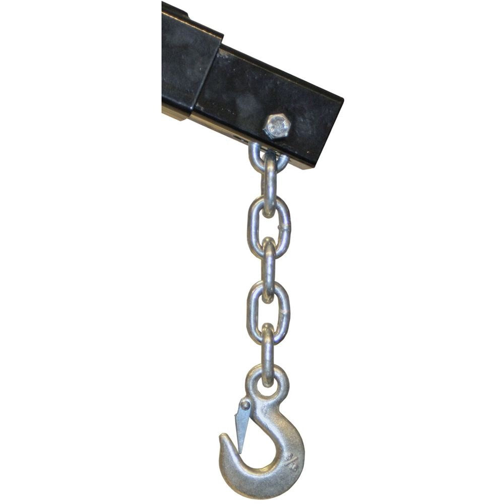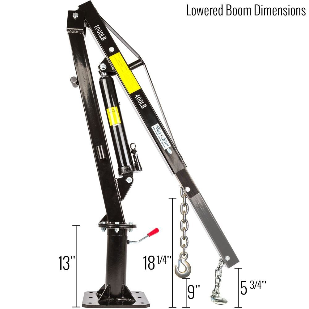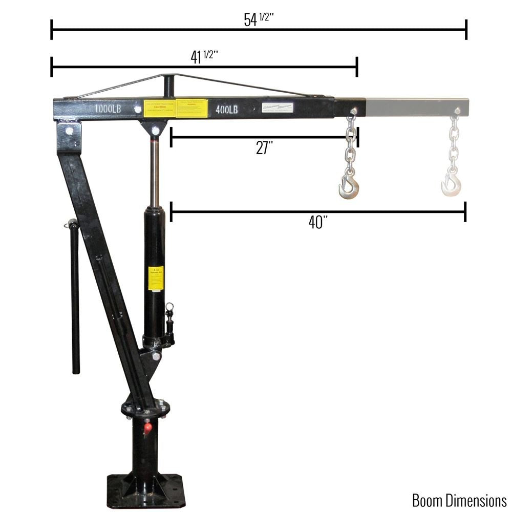 Portable jib crane for pickup truck or trailer beds. Allows for one person to easily lift heavy objects with a manual operated 3-ton hydraulic ram. Maximum capacity is 1,000 lbs. with the boom contracted and 400 lbs. with the boom extended. Jib swings 360 degrees with a swivel base with an integrated locking arm to restrict free-movement. The lift boom extends to 70-7/8" while the ram travels up to 15.5" maximum. Includes (8) pre-drilled 3/4" holes in the 10-5/8" square base-plate for mounting to a pickup truck or trailer bed (mount hardware sold separately). Made with heavy duty steel construction, black paint finish, heavy duty chain and hook.