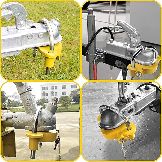 • 🔐HIGH-QUALITY: The trailer hitch lock is made of aluminum alloy with a yellow powder coating. The high-quality materials are sturdy, anti-rust, corrosion-resistant, and weather resistant.