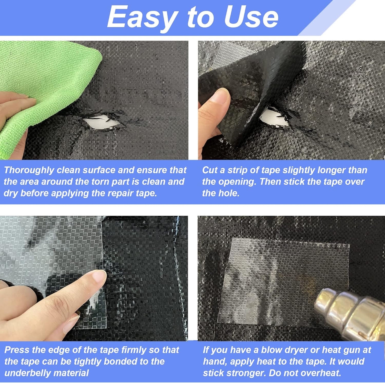 - Easy to Use: Cut a strip of tape slightly longer than the opening, then stick the tape and press the edge of the tape firmly so that the tape can be tightly bonded to the underbelly material. It would stick stronger if using a blow dryer or heat gun, apply heat to the tape. Do not overheat.