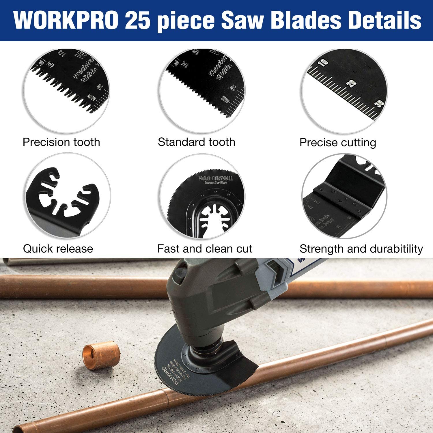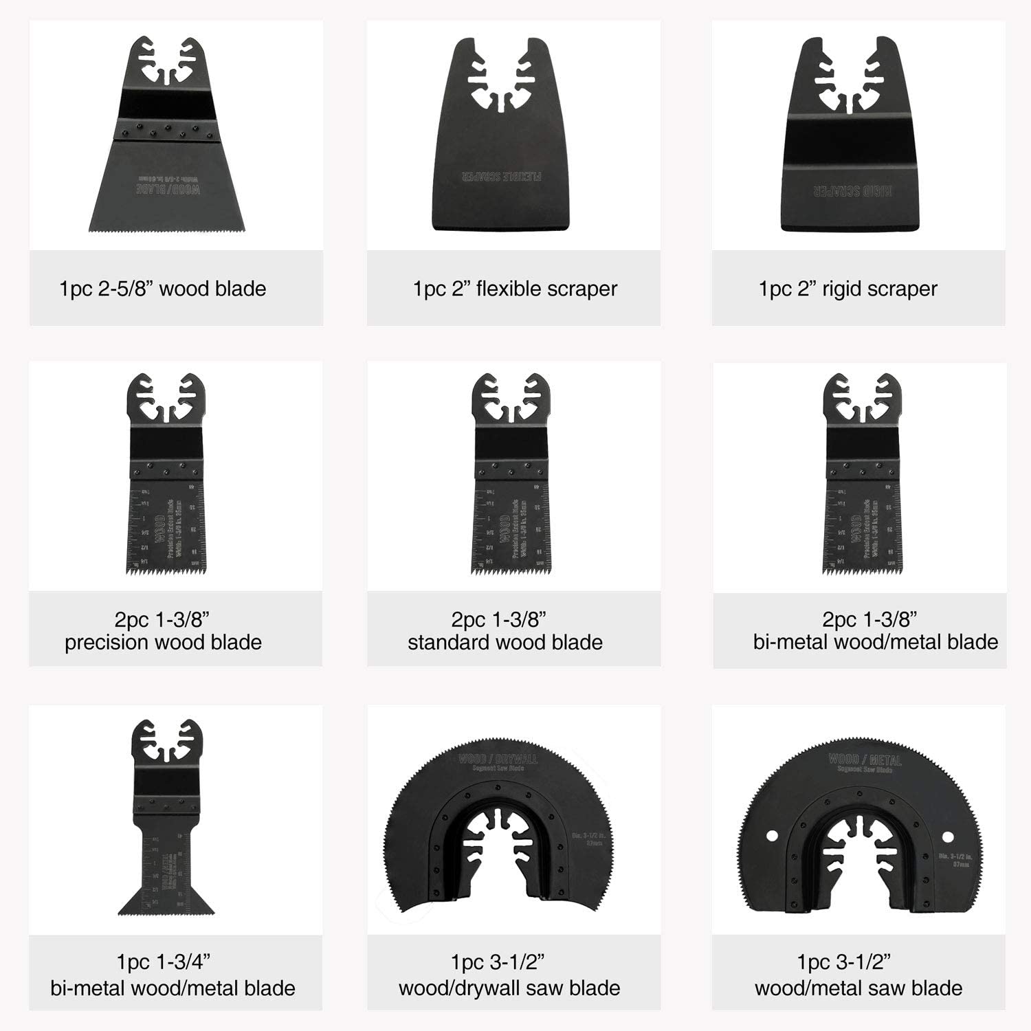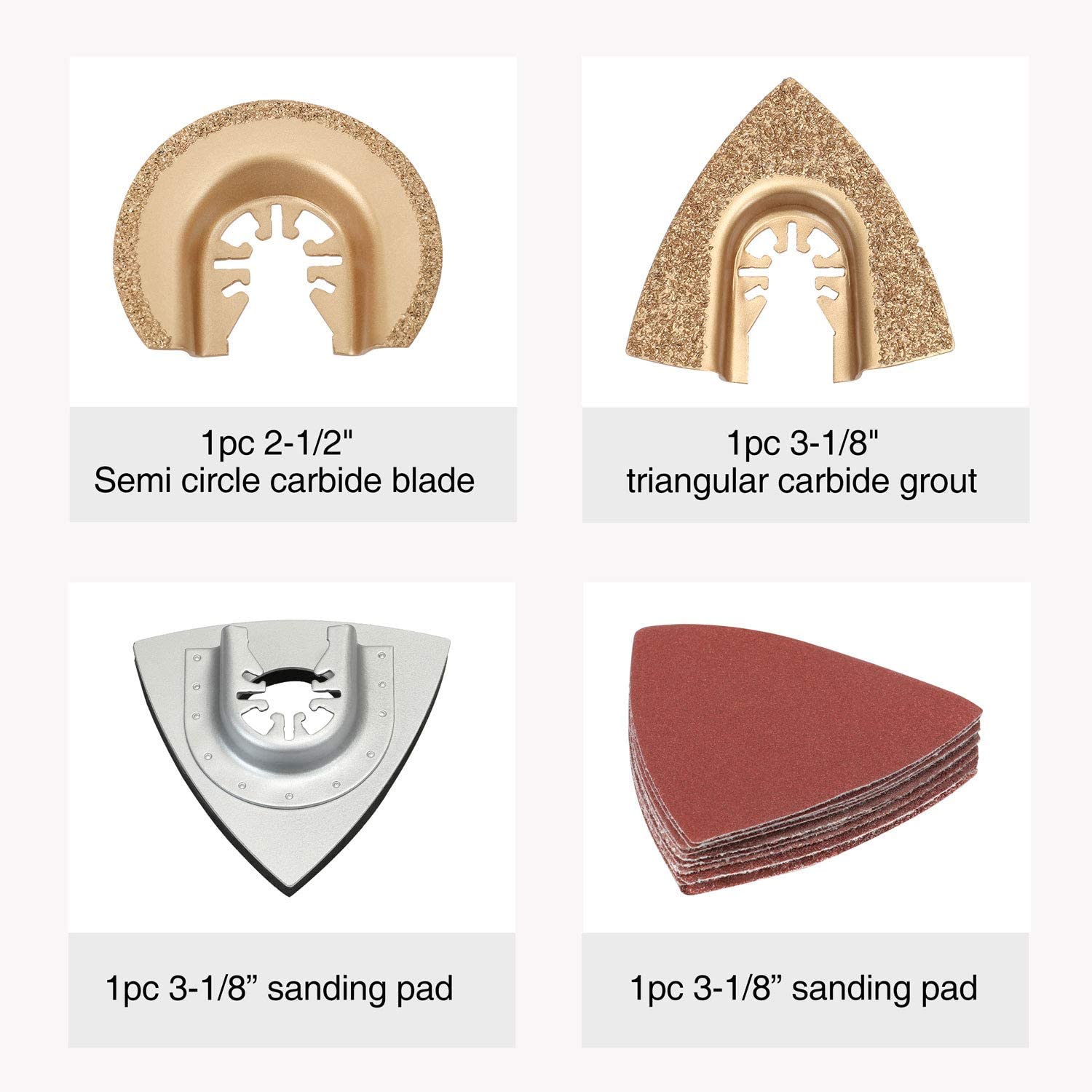25-piece Oscillating Accessory Kit: Contains wood/ metal end cut blades, sanding pad, sandpaper, carbide blade, grout removal rasp and scraper.